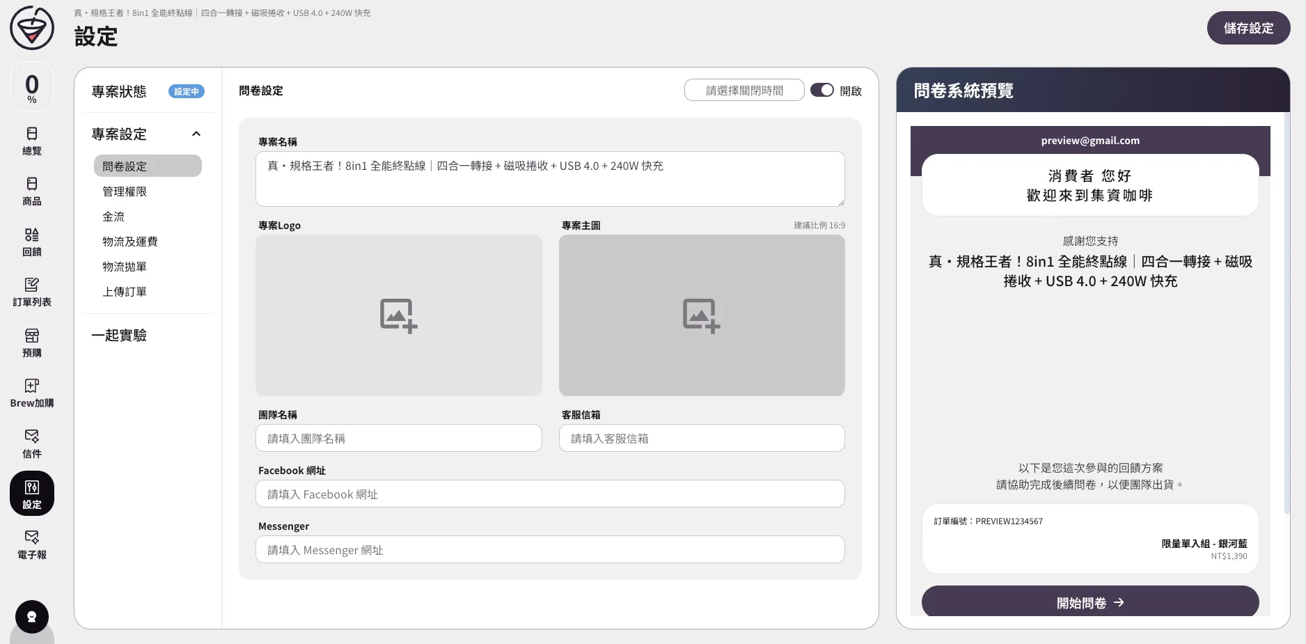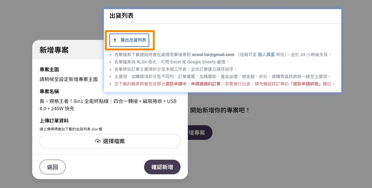 二、新增專案 Andy 2025年03月10日 08:35 更新於 點擊 新增專案 開始新增 BREW 專案 輸入在嘖嘖上的 網頁連結 上傳從嘖嘖後台下載的 出貨列表 ,完成後點擊確認新增 完成專案新增 相關文章 一、建立帳號 三、專案基本設定 八、信件