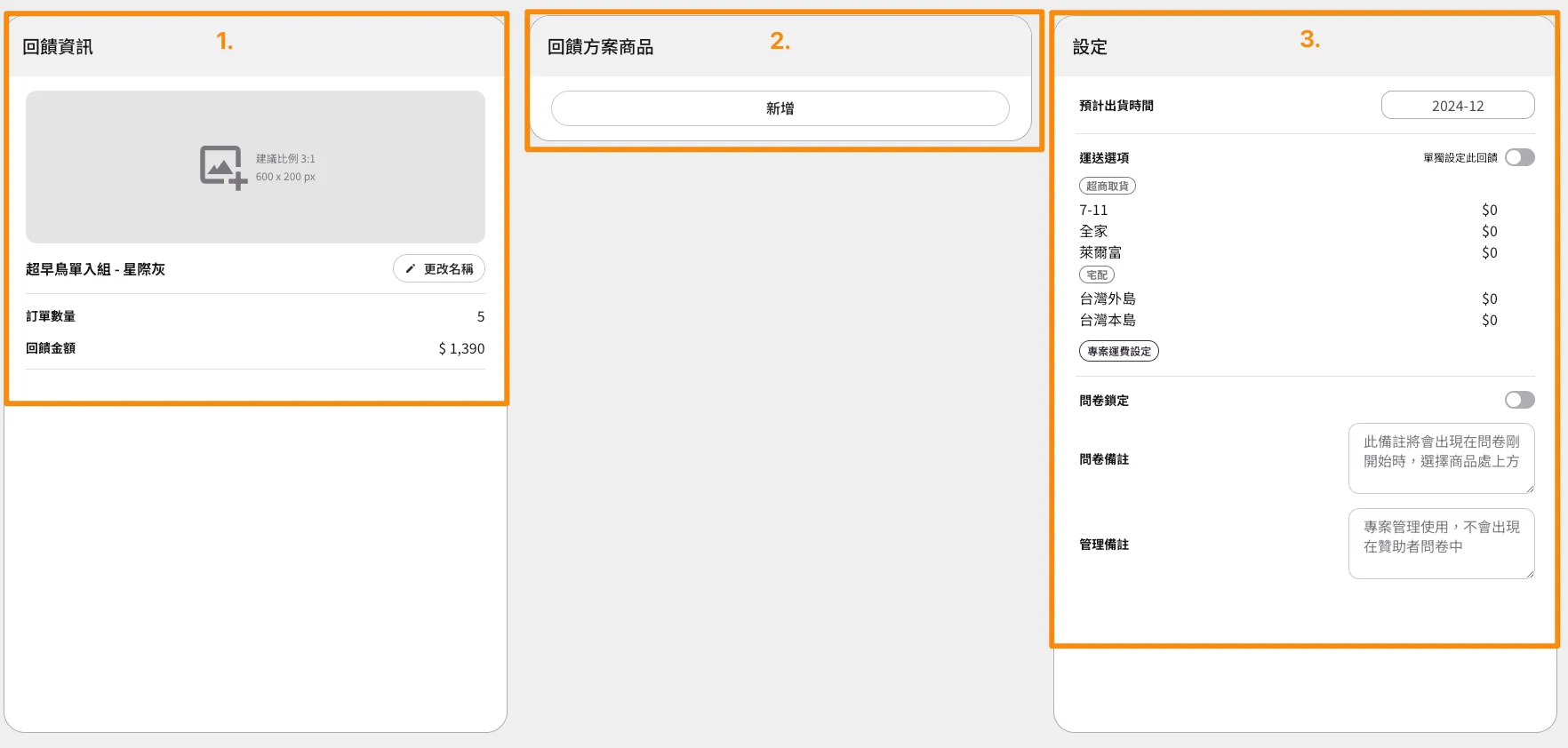 - 回饋資訊:可新增該回饋方案圖片、調整回饋名稱