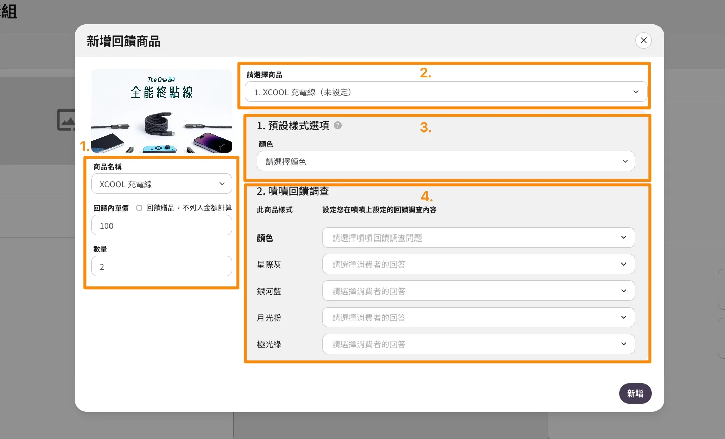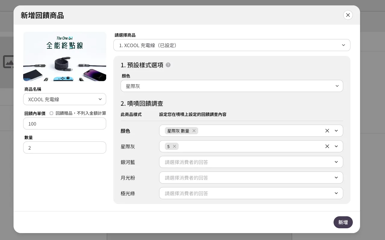- 選擇需要設定的商品,若此商品在回饋中的數量有 X ,則需設定 X 次